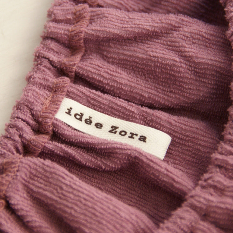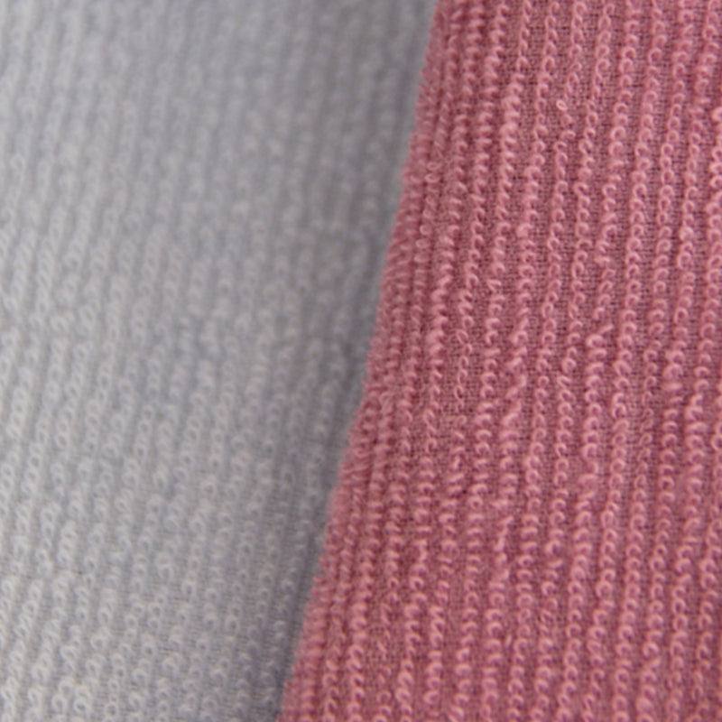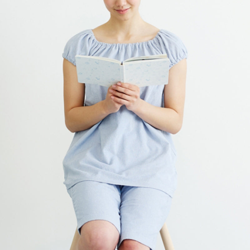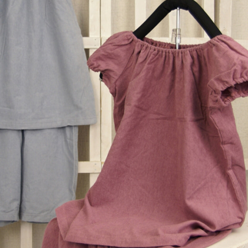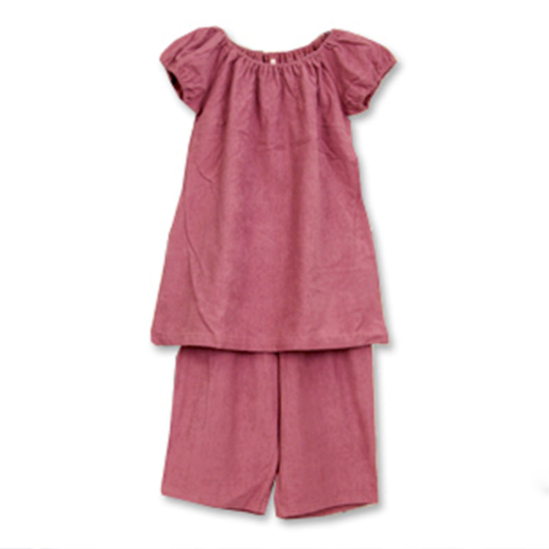 Nighty top and bottom set made of thinly woven toweling fabric.