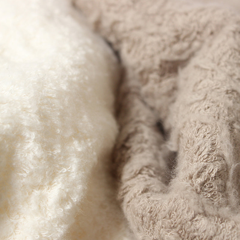 양털 가공이란? 파일을 먼저 앞으로 굴리는 롤러로 올리고, 다시 반대 방향으로 올리는 과정을 거칩니다. 이 과정은 원단을 더욱 촘촘하게 엮어 보풀 발생을 줄여줍니다. 부드럽고 폭신한 질감은 처음에는 보풀이 많이 생길 것 같지만, 이는 일반 파일 원단보다 훨씬 적은 보풀 발생을 유도하는 고기능 가공입니다. (보풀 발생률: 0.01%)