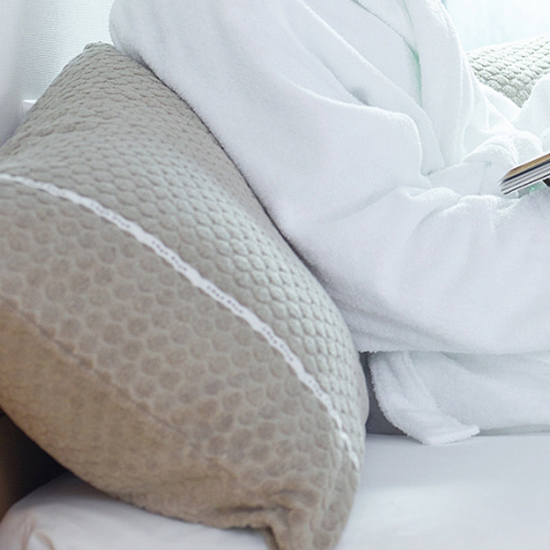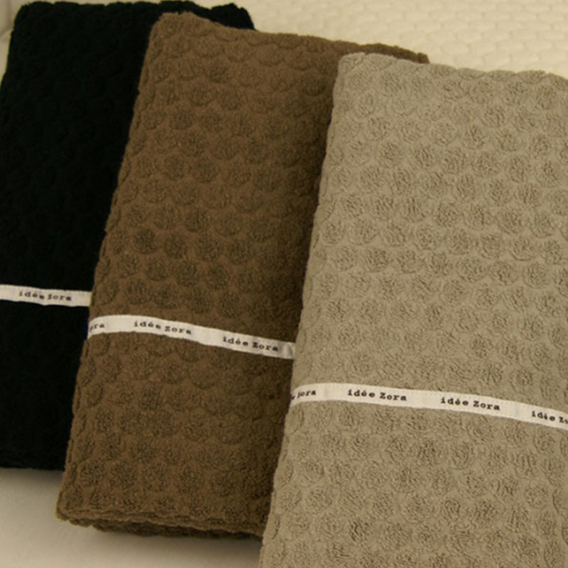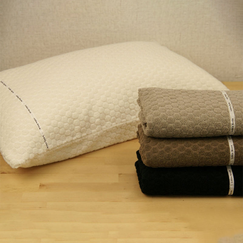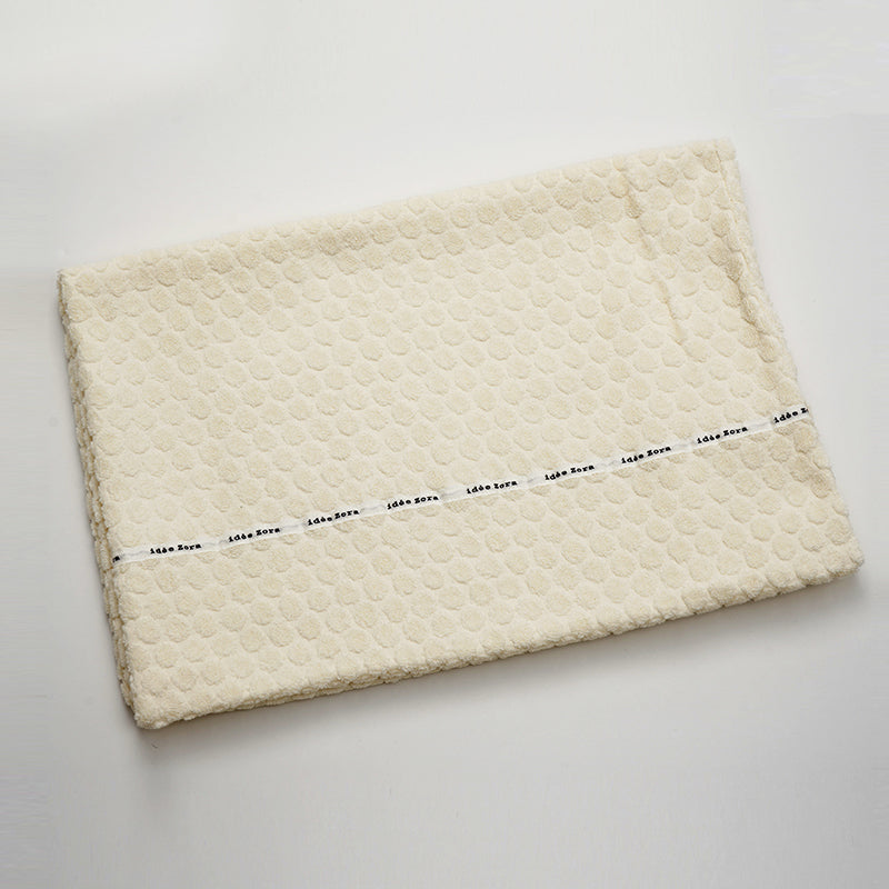 Pillow case made of single-color dyed towel with dot pattern.The "idee Zora" logo tape is an accent.