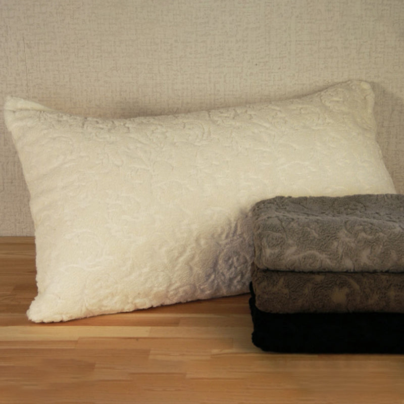 The long pile adds volume to the jacquard weave with a botanical pattern.