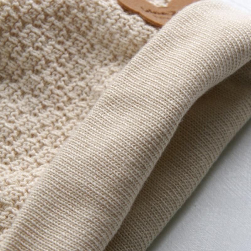 The inside of the garment, which is in direct contact with the baby's skin, is made of a special yarn that has a soft, non-ply texture, but also has high yarn strength and minimal shedding, giving it a gentle feel.