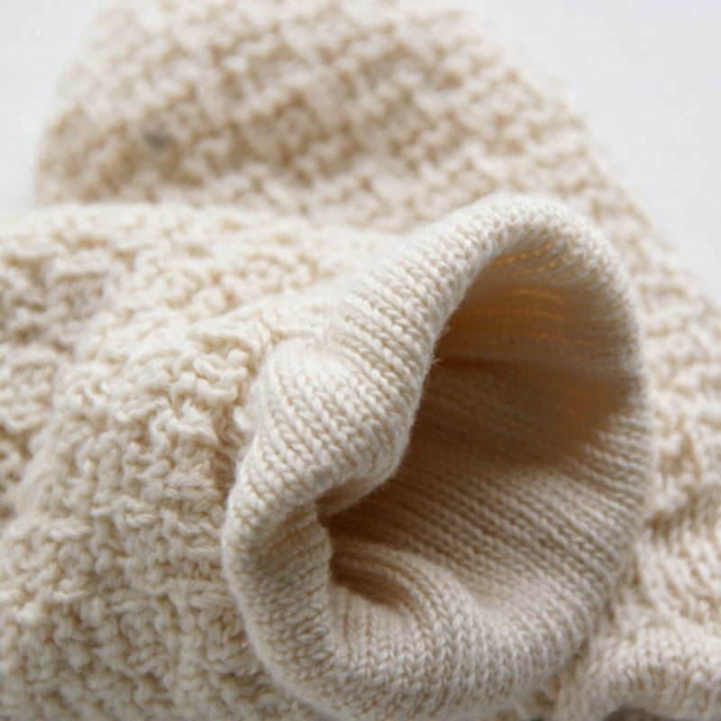 The inside, which is in direct contact with the baby's skin, has a soft, non-ply yarn-like texture.The inside, which is in direct contact with baby's skin, is made of a special yarn that is soft like non ply yarn, but has high yarn strength and minimal shedding, giving it a gentle touch.